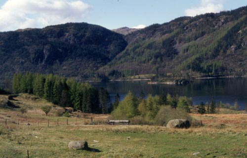 | A view of Thirlmere from the main road. This ribbon lake is also used for water supply and in this case conifers probably enhance the landscape.(152K)