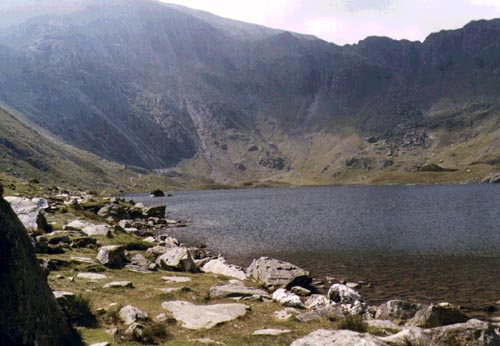 | A view of Llyn Idwal in Snowdonia, a cwm or corrie. You can clearly see the steep backwall. (160K)